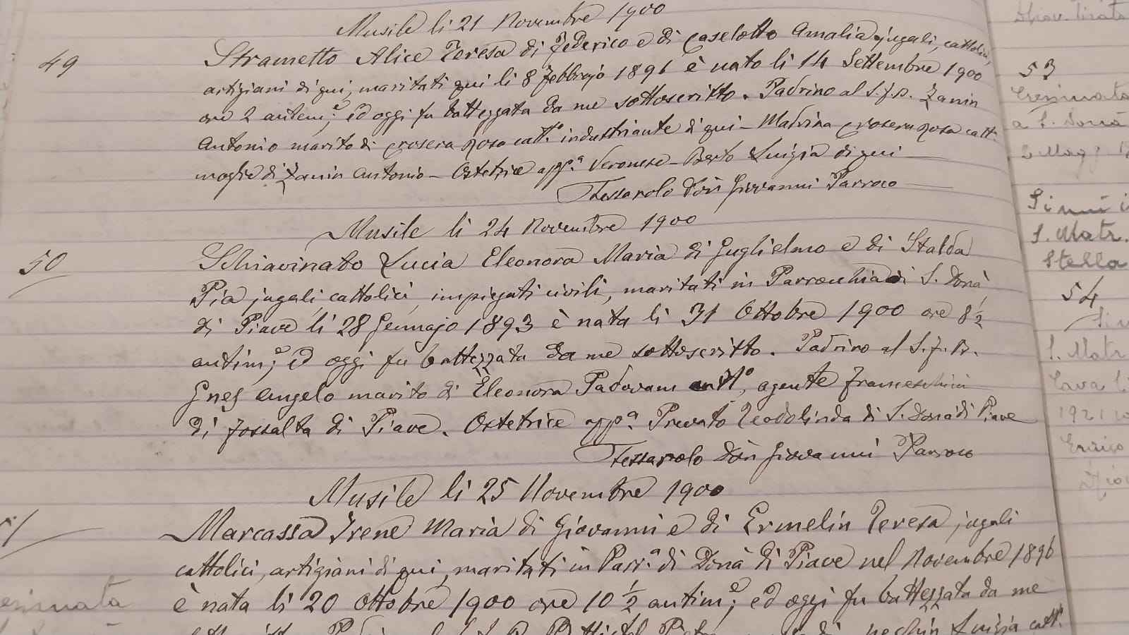 Nella chiesa di Musile, esposto il registro parrocchiale che riporta il battesimo di Lucia, nata a Musile il 31 ottobre 1900 alle 8.30